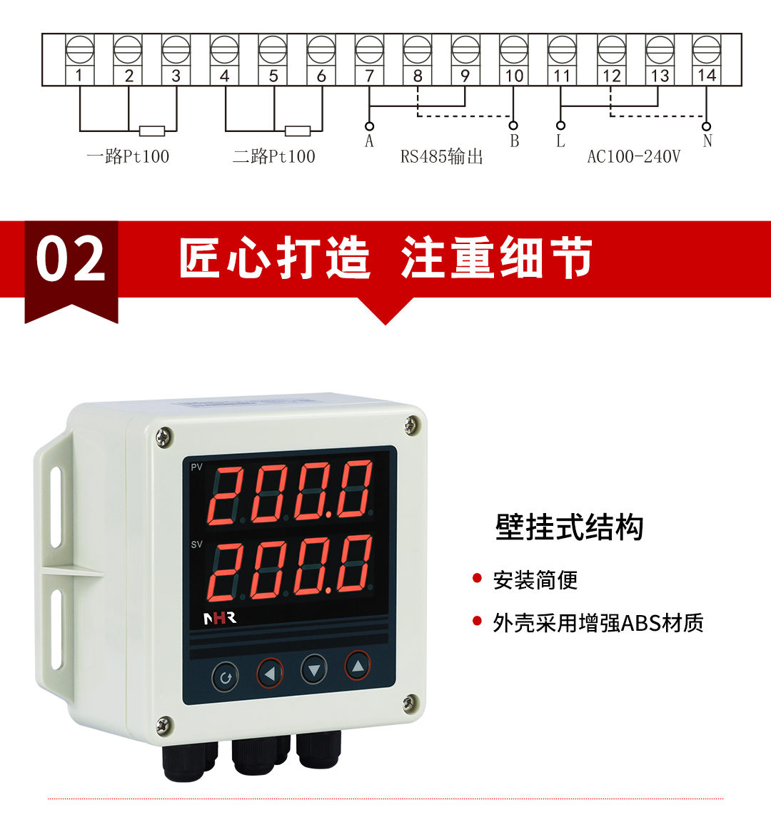 NHR-XTRT系列溫度遠(yuǎn)傳監(jiān)測儀采用了表面貼裝工藝,全自動貼片機(jī)生產(chǎn),具有很強(qiáng)的抗干擾能力。本儀表支持兩路PT100輸入,實(shí)現(xiàn)對溫度物理的測量顯示,帶RS485通訊輸出功能,帶雙屏數(shù)碼管顯示,上窗口顯示第1路測量值,下窗口顯示第2路測量值。