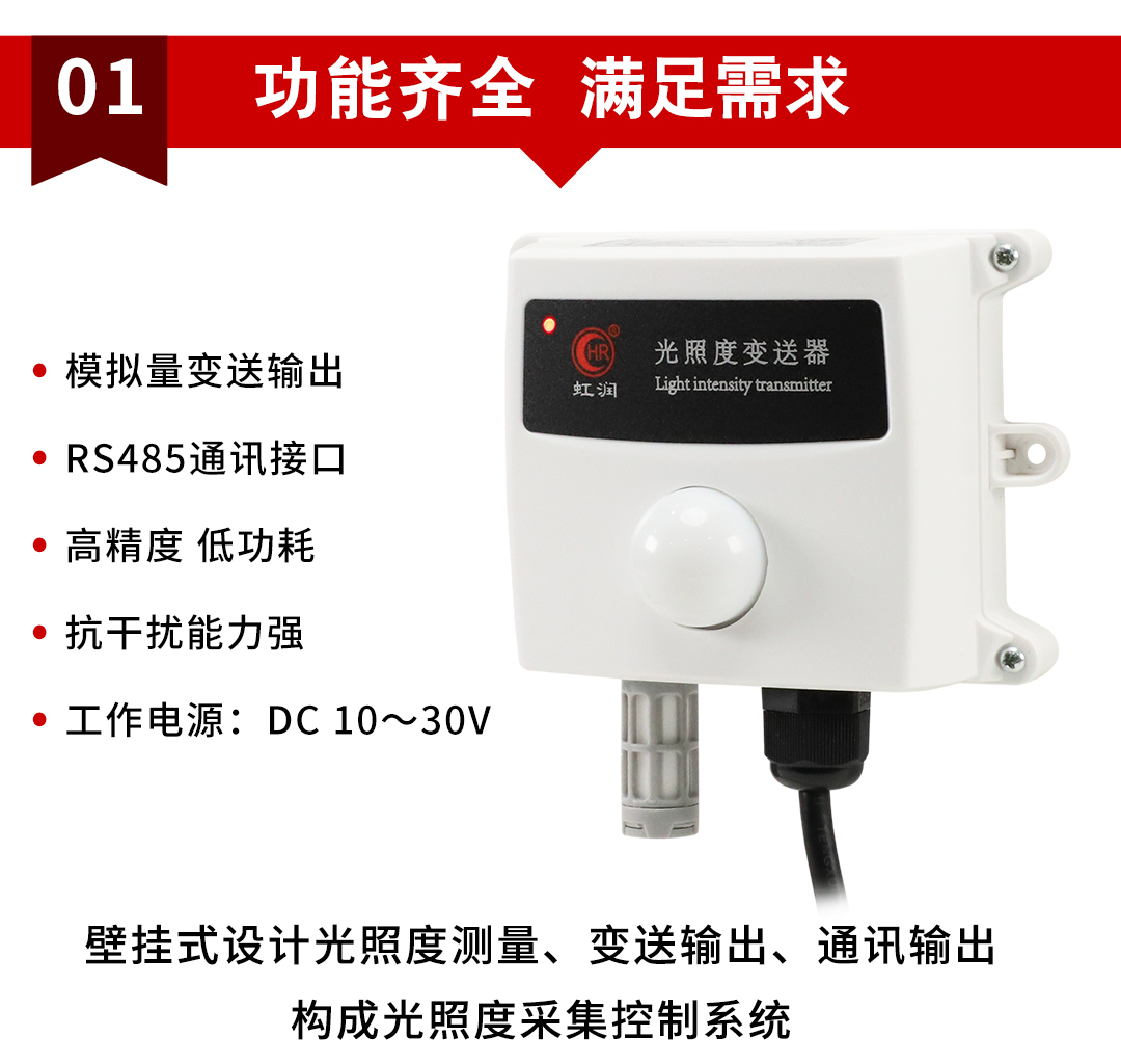 虹潤公司是專業(yè)生產(chǎn)環(huán)境監(jiān)測儀表的國家專精特新“小巨人”企業(yè)。生產(chǎn)的光照度變送器,具有高精度感光傳感器,響應靈敏,準確度高,低功耗,模擬量變送輸出或RS485通訊等特點。產(chǎn)品獲得一種農(nóng)業(yè)監(jiān)控變送器、一種儀表電源等2項實用新型專利,主持起草現(xiàn)場設備集成等5項智能制造國家標準,以及現(xiàn)場設備工具(FDT)接口規(guī)范、物聯(lián)網(wǎng)總體技術智能傳感器特性與分類等2項國家標準,參與國際5G標準制定,取得農(nóng)業(yè)監(jiān)測變送器等3項相關軟件著作權。產(chǎn)品廣泛應用于溫室大棚、花卉養(yǎng)殖、科研實驗、智能樓宇、戶外照明等環(huán)境場合對光照度的檢測。