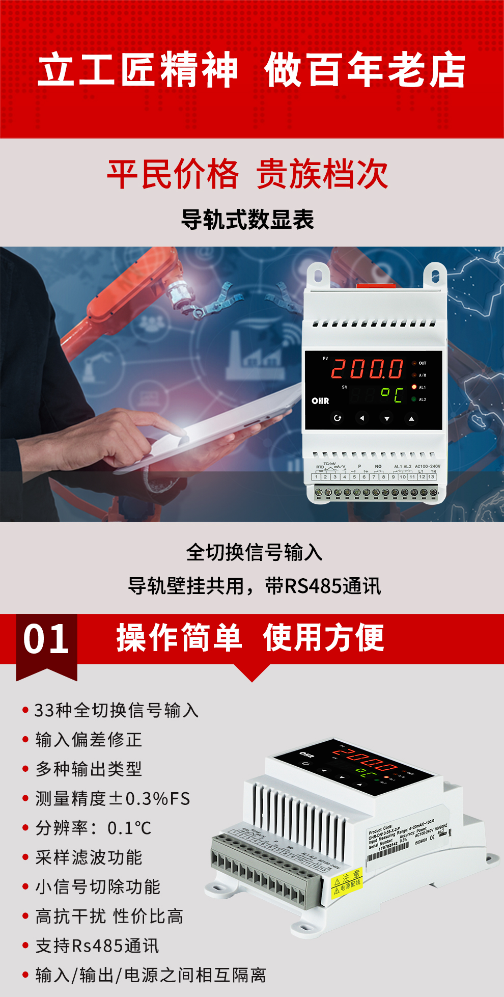 虹潤公司是專業(yè)生產(chǎn)數(shù)顯表的國家專精特新“小巨人”企業(yè),生產(chǎn)的導軌式數(shù)顯儀表,具有全切換信號輸入,導軌壁掛共用,全隔離設(shè)計,高抗干擾,變送輸出或RS485通訊等特點。產(chǎn)品獲得巡回檢測顯示方法及裝置、工業(yè)模塊的導軌式安裝結(jié)構(gòu)等2項國家發(fā)明專利,主持起草工業(yè)過程控制系統(tǒng)用模擬輸入兩位或多位輸出儀表、物聯(lián)網(wǎng)智能溫度儀表通用技術(shù)條件等2項國家標準,,以及通信系統(tǒng)多通道數(shù)據(jù)采集控制終端規(guī)范軍用標準,參與國際5G標準制定,取得簡易數(shù)顯儀表等3項相關(guān)軟件著作權(quán)。產(chǎn)品廣泛應用于電力、石化、冶金、化工、造紙、食品、輕工、制藥、熱處理、水處理、機械配套等各種工業(yè)現(xiàn)場。