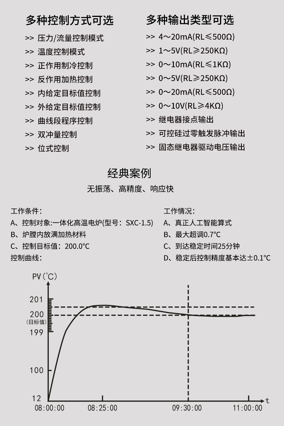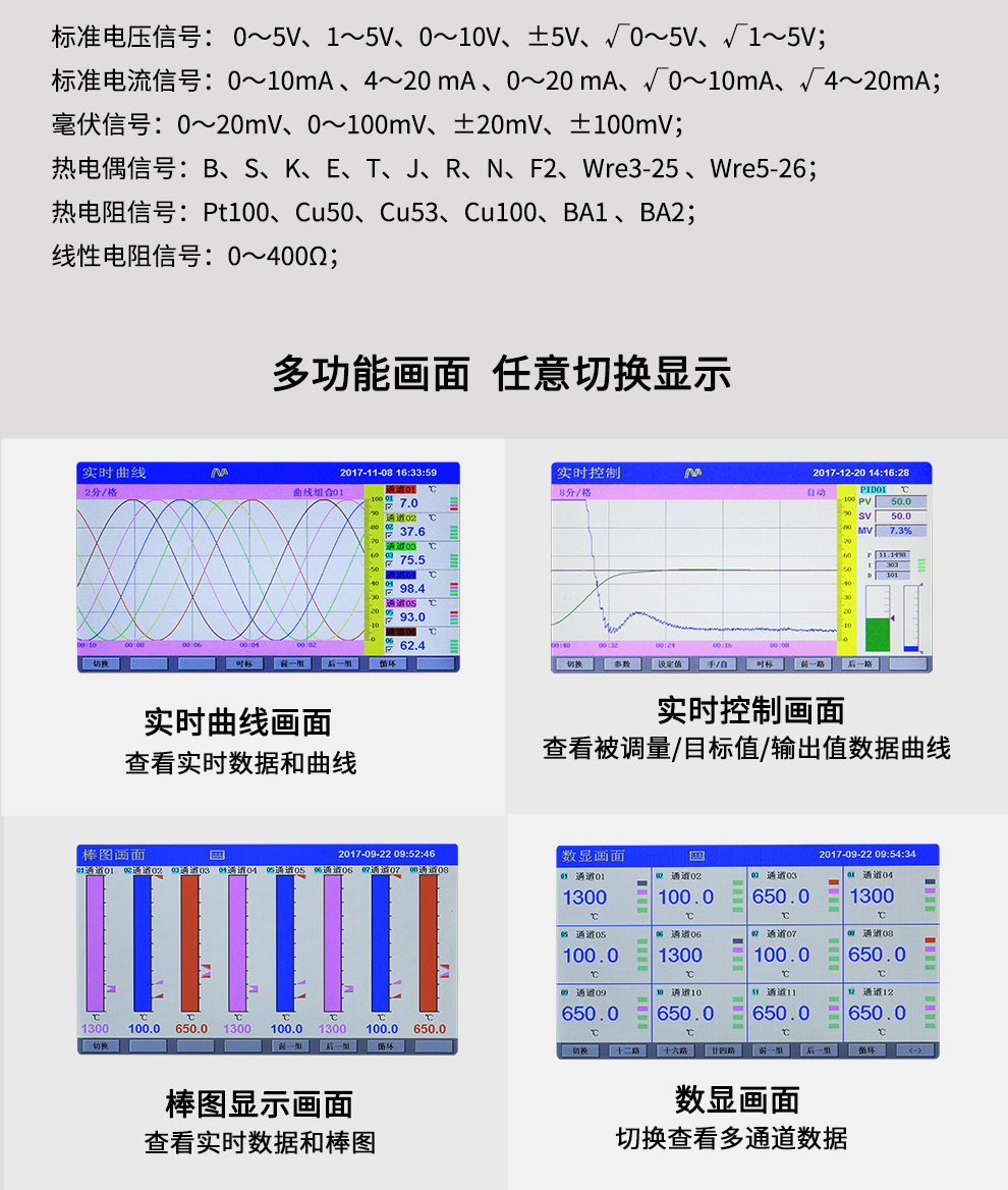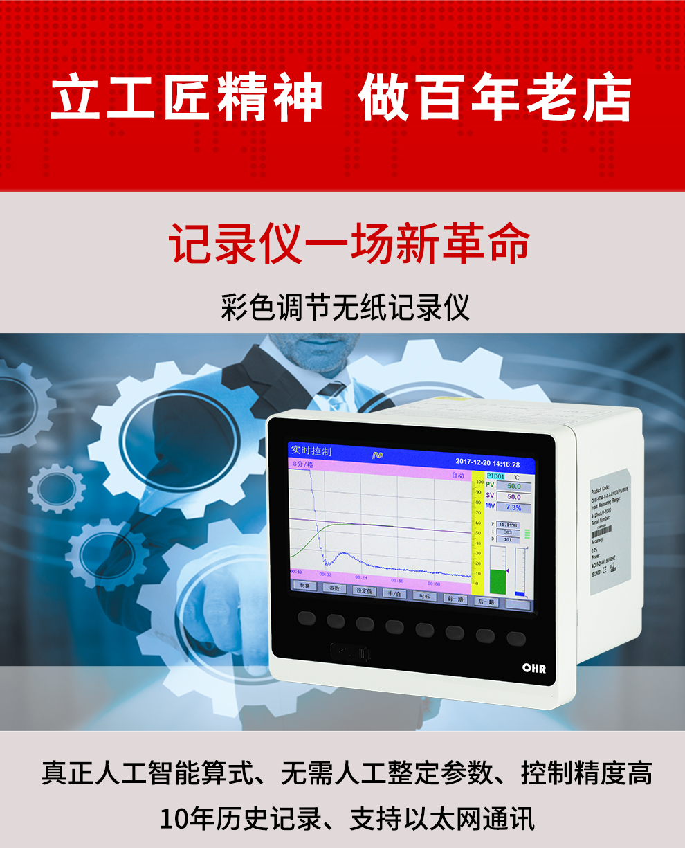 OHR-H300系列彩色調節(jié)無紙記錄儀采用真正的人工智能算式,儀表啟動自整定功能,可根據(jù)被控對象的特性,自動尋找最優(yōu)參數(shù)以達到很好的控制效果,無需人工整定參數(shù)??販鼐然具_±0.1℃,無超調、欠調,達國際先進水平。24路萬能輸入(可組態(tài)選擇輸入:標準電壓、標準電流、熱電偶、熱電阻、毫伏等)其中可帶8路控制輸入。