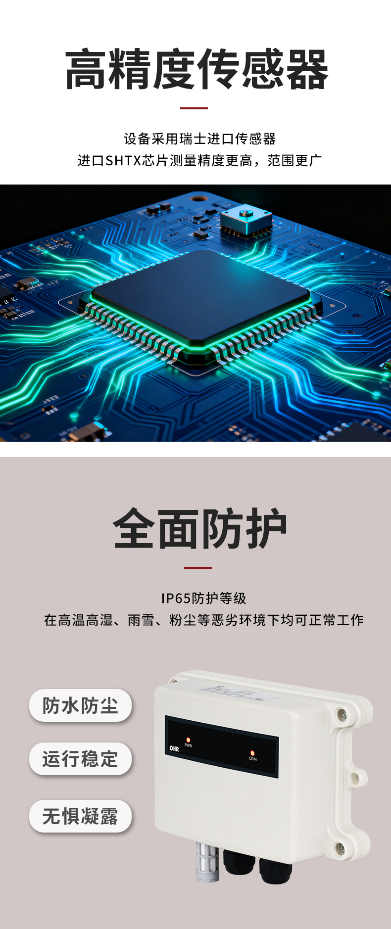 虹潤公司是專業(yè)生產(chǎn)環(huán)境監(jiān)測(cè)儀表的國家專精特新“小巨人”企業(yè)。生產(chǎn)的一體式溫濕度變送器,具有溫度、濕度、露點(diǎn)高精準(zhǔn)的測(cè)量與變送,報(bào)警繼電器輸出,RS485/RS232通訊,IP65防護(hù)等級(jí)等特點(diǎn)。產(chǎn)品獲得一種手持式低功耗溫濕度檢測(cè)儀、大屏幕溫濕度記錄儀等2項(xiàng)國家發(fā)明專利,主持起草物聯(lián)網(wǎng)智能溫度儀表通用技術(shù)條件、冷鏈溫度記錄儀等2項(xiàng)國家標(biāo)準(zhǔn),以及通信系統(tǒng)多通道數(shù)據(jù)采集控制終端規(guī)范軍用標(biāo)準(zhǔn),以及現(xiàn)場(chǎng)設(shè)備集成等5項(xiàng)智能制造國家標(biāo)準(zhǔn),參與國際5G標(biāo)準(zhǔn)制定,取得溫濕度儀表等3項(xiàng)相關(guān)軟件著作權(quán)。產(chǎn)品廣泛應(yīng)用于工業(yè)現(xiàn)場(chǎng)、農(nóng)業(yè)大棚、倉儲(chǔ)物流、地下管廊、養(yǎng)殖孵化、配電機(jī)房等諸多領(lǐng)域。