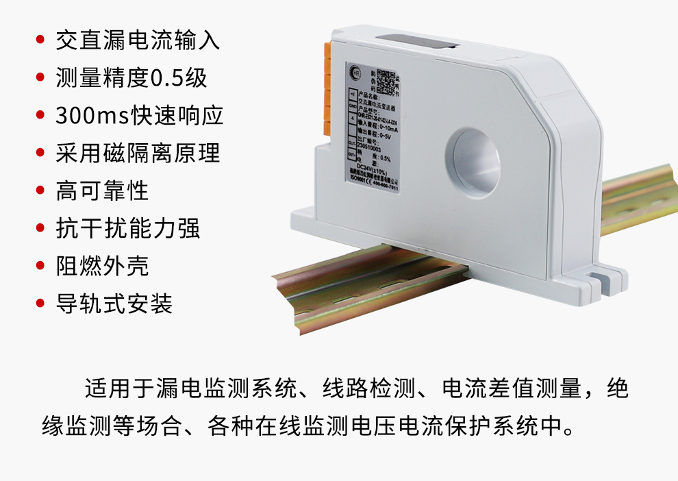 OHR-ES30系列交流/直流漏電流變送器對電網(wǎng)和電路中的交直流電流信號進行實時測量,具有高精度、高隔離、 低漂移、低功耗、體積小、響應快、抗干擾能力強等特點。本產(chǎn)品采用標準DIN35mm導軌安裝,端子接線,安裝方 便,適用于測量漏電監(jiān)測系統(tǒng),線路檢測,電流差值測量,絕緣監(jiān)測等場合。