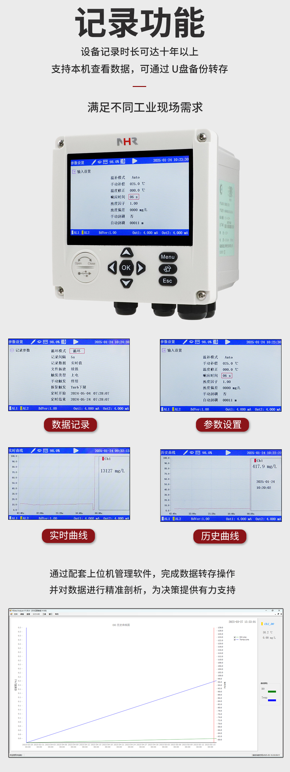 虹潤(rùn)公司是專業(yè)生產(chǎn)水質(zhì)分析儀的國(guó)家專精特新“小巨人”企業(yè)。生產(chǎn)的濁度/污泥記錄儀,具有彩色大屏顯示,測(cè)量精準(zhǔn)穩(wěn)定不跳字,數(shù)據(jù)記錄與轉(zhuǎn)存,RS485/以太網(wǎng)通訊,配套上位機(jī)管理軟件等特點(diǎn)。產(chǎn)品獲得一種平板無(wú)紙記錄儀、智能化控制器等2項(xiàng)國(guó)家發(fā)明專利;主持起草物聯(lián)網(wǎng)智能記錄儀表通用技術(shù)條件、現(xiàn)場(chǎng)設(shè)備工具(FDT)接口規(guī)范.、過(guò)程分析技術(shù)系統(tǒng)等3項(xiàng)國(guó)家標(biāo)準(zhǔn),以及通信系統(tǒng)多通道數(shù)據(jù)采集控制終端規(guī)范軍用標(biāo)準(zhǔn),參與國(guó)際5G標(biāo)準(zhǔn)制定;取得濁度、污泥濃度無(wú)紙記錄儀等3項(xiàng)相關(guān)軟件著作權(quán)。產(chǎn)品廣泛應(yīng)用于市政供水、污水處理、食品、制藥、造紙、石化、冶金、水處養(yǎng)殖等諸多領(lǐng)域。