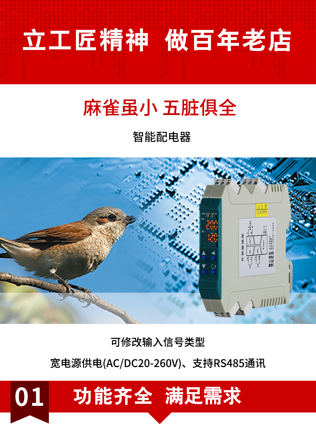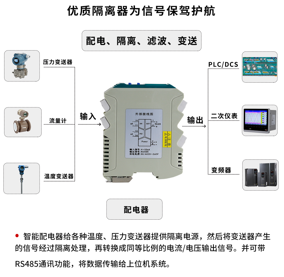 NHR-X33系列導軌式智能配電器給二、三線制變送器提供隔離的電源電壓,將變送器產(chǎn)生的直流電壓電流信號,經(jīng)本隔離器轉(zhuǎn)換成所需的輸出信號至控制系統(tǒng)。寬電源設(shè)計:20-260V交直流供電。配置高清顯示單元,通過輕觸按鍵設(shè)置每個通道的參數(shù)及每個通道之間的切換。
