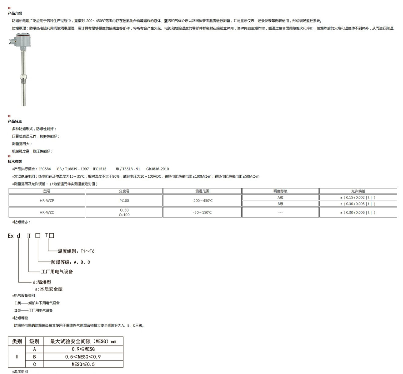 防爆熱電阻廣泛應用于各種生產(chǎn)過程中,直接對-200~450℃范圍內(nèi)存在碳氫化合物等爆炸的液體、蒸汽和氣體介質(zhì)以及固體表面溫度進行測量,并與顯示儀表、記錄儀表等配套使用,形成現(xiàn)場監(jiān)控系統(tǒng)。